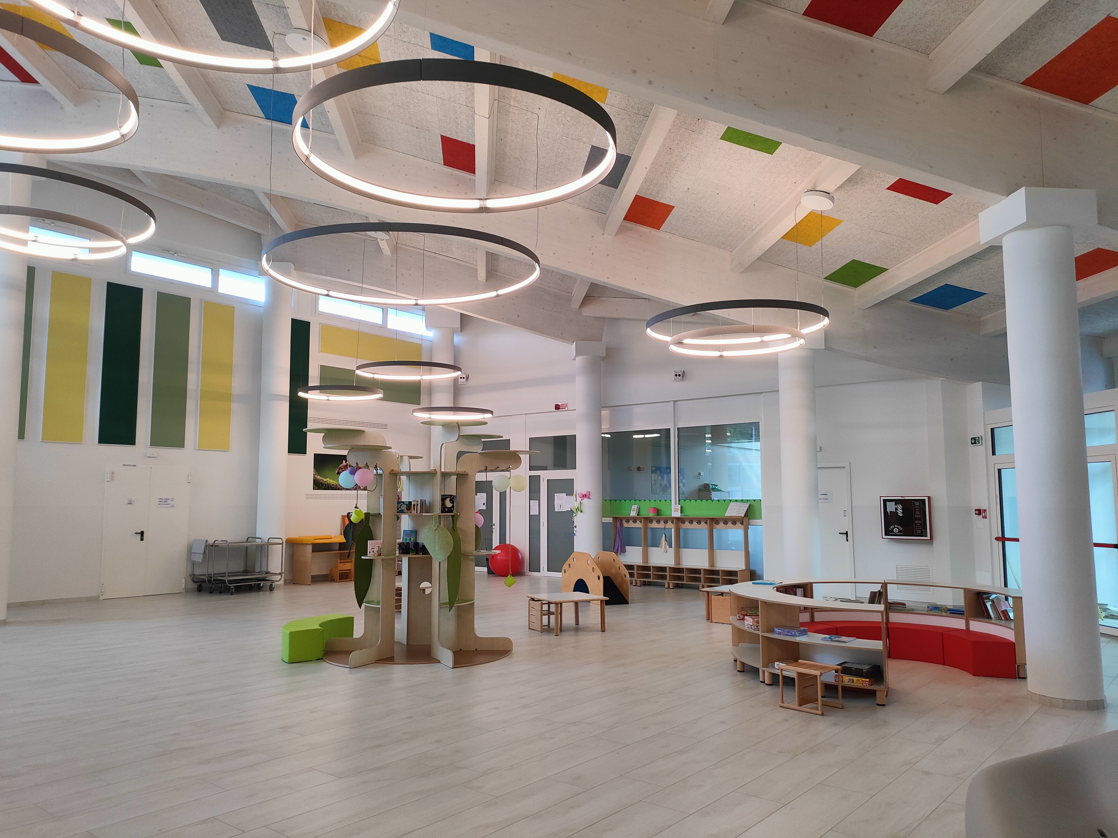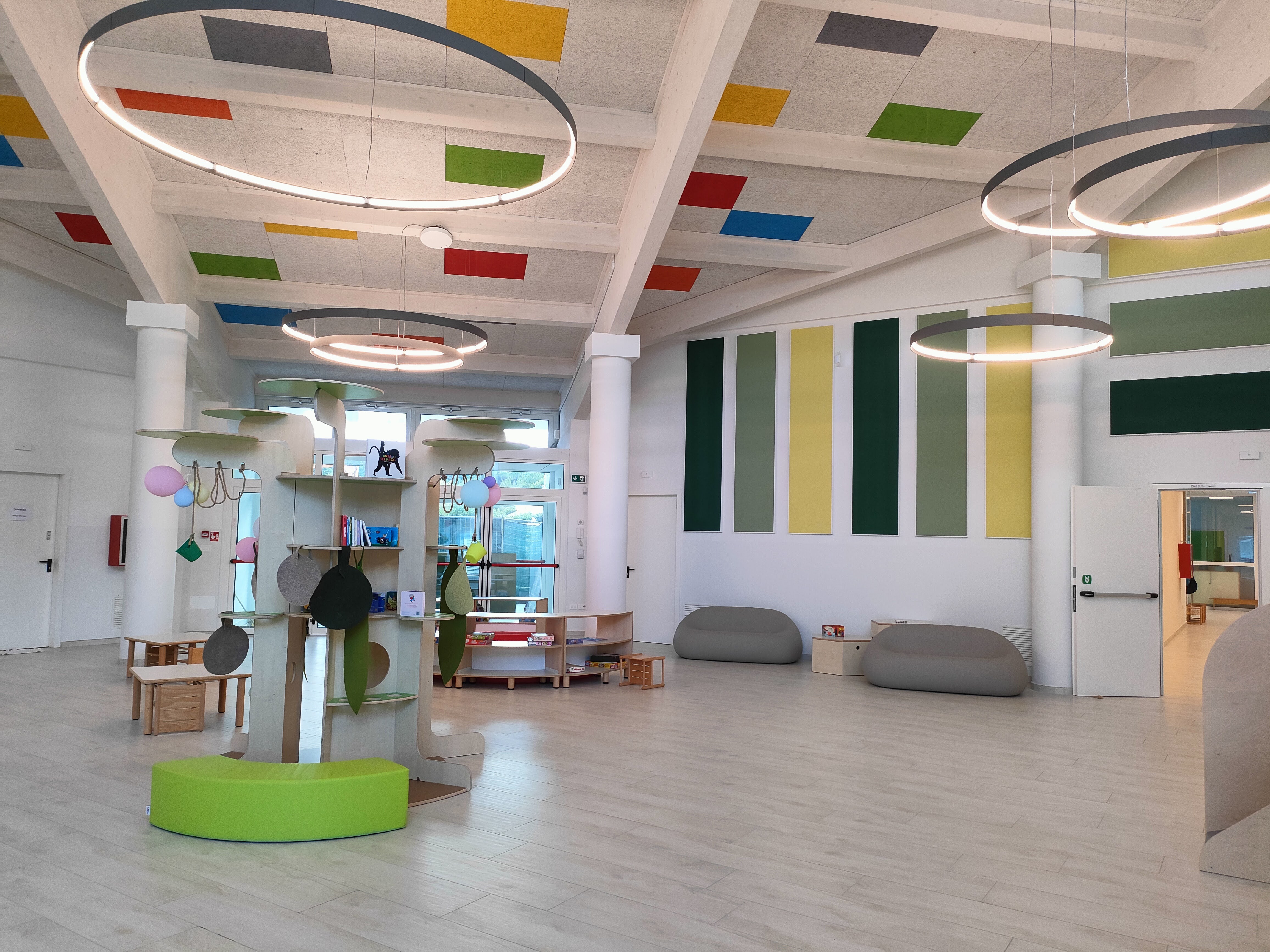 un grande salone colorato e accogliente, cuore della vita scolastica e punto di incontro tra nido e infanzia