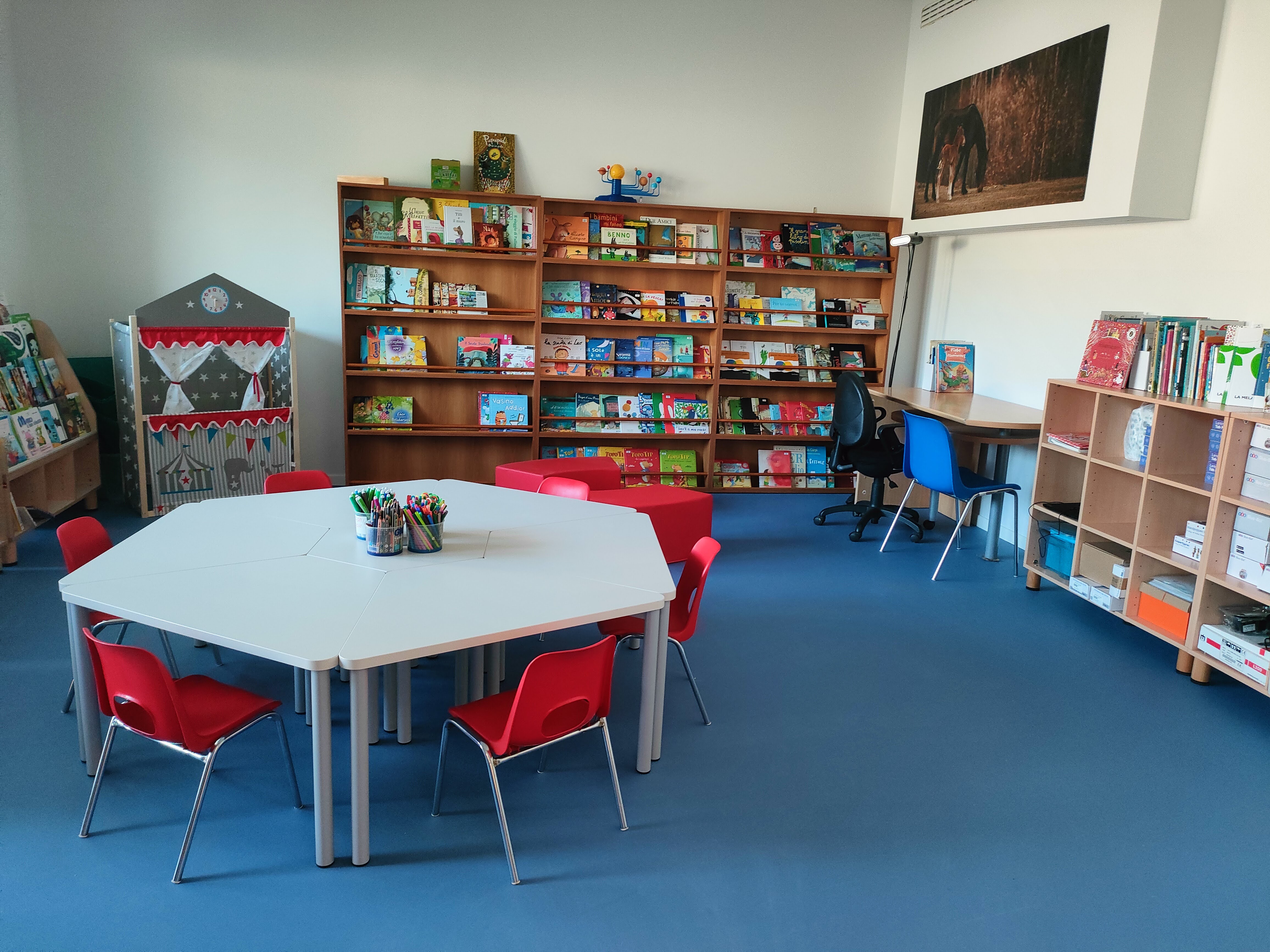 una sala del riposo trasformata in biblioteca e laboratorio creativo